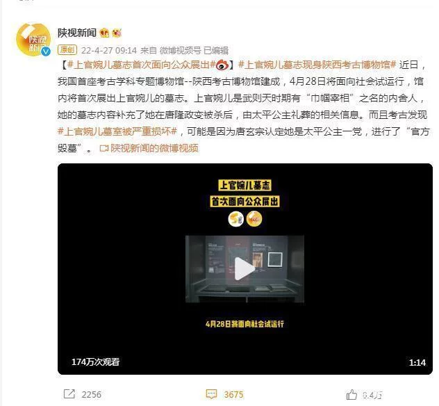 近日,我国首座考古学科专题博物馆--陕西考古博物馆建成,4月28日将面向社会试运行,馆内将首次展出上官婉儿的墓志。上官婉儿是武则天时期有“巾帼宰相”之名的内舍人,她的墓志内容补充了她在唐隆政变被杀后,由太平公主礼葬的相关信息。而且考古发现上官婉儿墓室被严重损坏,可能是因为唐玄宗认定她是太平公主一党,进行了“官方毁墓”。