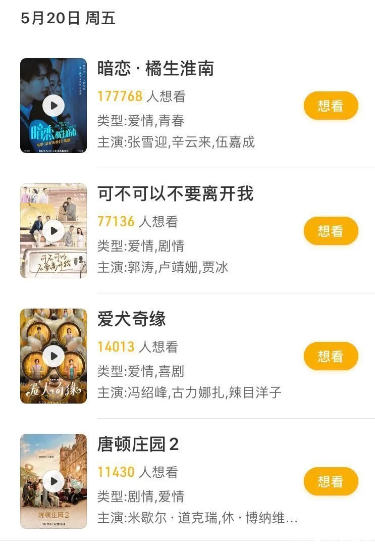 “520”档期扎堆上映的6部影片多是爱情片,关注度比较高的有《暗恋·橘生淮南》《爱犬奇缘》《可不可以不要离开我》和《唐顿庄园2》。《暗恋·橘生淮南》根据同名长篇小说改编,由黄斌执导,原著作者刘婉荟担任编剧,张雪迎、辛云来、伍嘉成领衔主演。《爱犬奇缘》由陈国辉、夏永康编剧并执导,冯绍峰、古力娜扎领衔主演,辣目洋子等主演。《可不可以不要离开我》由王子鸣、萧飞导演, 陈乔恩、贾冰、郭涛等主演。这几部爱情题材电影,从演员到故事题材都具有一定的市场吸引力,至于票房前景,可能也需要市场给出答案。